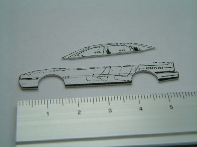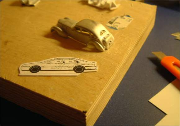 Downsizing It is always a good idea to check the drawing in regard to accuracy ... do length, width, wheelbase etc. match the specs? No problems in our case, the dimensions are true to scale. With a graphics program (or just a b/w copier) the „blueprint" is scaled down to exact 87th scale * and then printed out. * We don’t need to worry about making the master bigger to compensate for shrinking moulds – the modern moulding components and resins have neglectable shrinking factors of 0.05% and less. Time: 6 min., total: 8 min. The stencil To obtain a reusable template the photo is glued to 1 mm plastic sheet and precisely cut out. I still have to think about cutting the roof off at this point, which would help to model the sloped window area seperately.