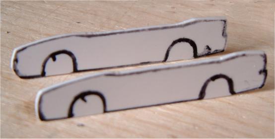 The little piece of plastic is now employed to bring the Volvo’s shape onto the styrene. Furthermore I will need this stencil throughout the entire building process to regularly re-examine the master. Time: 26 min., total: 34 min.