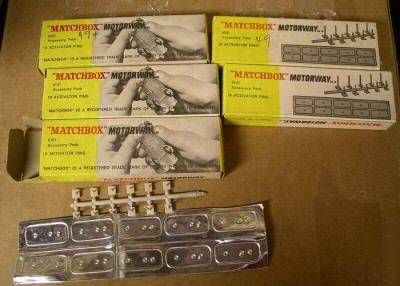 models used (were these ever sold in the sets ?) is welcome ! Pictured above are accessory packs for the Matchbox Motorway, the little pins of greyish plastic that went into the slot in the track were fitted to the bottomplate of the model by means of the transparent selfadhesive pieces also pictured.