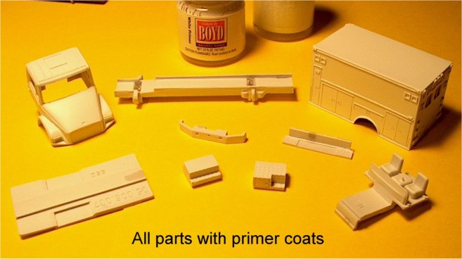 Once your parts have dried completely (give at least a good two hour drying time at room temp.), inspect the parts one more time for blemishes or secretions and prepare for primer. Priming is a must for resin kits as this will provide a good base for the paint coats to adhere, and priming will reveal surface blemishes that the naked eye may not catch with initial inspections. After one light coat of primer, I once again inspected for blemishes and found a slight mould variance in the door of one of the cabs and the hood blemish on the other didn’t go away, so out came the sand paper again. After light wet sanding from 400 to 600 grit sandpaper (make sure if you wet sand over primed areas, that these areas are cleaned off with a damp cloth and allowed to dry), the parts were ready for a second coat of primer. The second coat was a little heavier and went on smoothly, showing clean cab and body parts. No more sanding, Yeah!