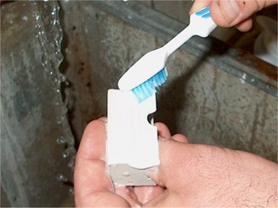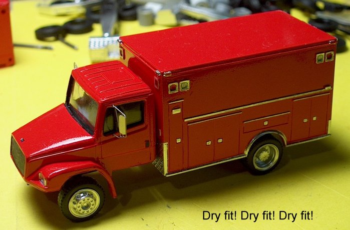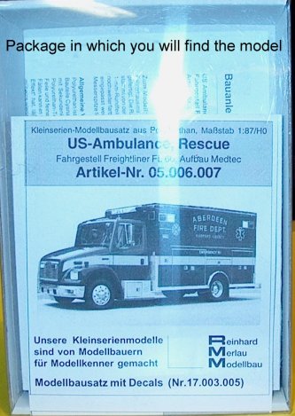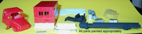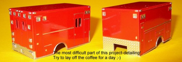 The kit which is focused upon here is RMM’s "US-Ambulance, Rescue" Artikel-Nr.05.006.007. This is a resin kit of a Freightliner ambulance typical of many seen in use with suburban and rural fire departments in North America. It is a beautiful little kit with excellent mould quality and fit and finish are the easiest I have encountered with a resin kit yet. Prices for this kit range from $40.00 to $65.00 US and the kit is available from a couple of different retailers. It is composed of 23 individual parts including Herpa beverage truck type tires (low profile) and wheels, the ambulance body, underframe, cab, cab "glass" insert, rear step bumper, frame tool boxes/steps, interior (seats and dash, separate Herpa-type truck steering wheel), front bumper, ambulance body floor, a "lightbar" moulded in some sort of clear soft polyresin and a beautiful stainless steel photoetched grille. Upon opening the box, you will find the kit in raw resin moulded form. Some parts, such as the front and rear bumpers and the frame mounted tool boxes are still set in mould flash and must be removed and sanded down to correct thickness. This was the first thing I did. After removing the flash and sanding these parts, I then dry fitted (dry fitting is testing the overall fit before gluing) the cab, frame, ambulance body, front and rear bumpers. I found some warpage in the body of one of the kits, but nothing serious enough to compromise fit and when I dry fitted the floor of this body, it pushed out the warpage. I also found heavier flash on the driver’s side bottom of the ambulance body on both kits, this was sanded to even out. The cab on one of the kits also had a significant amount of mold release goo on the upper passenger side door frame, but we’ll get to this later. The cab hood on one of the units had some slight blemishes that needed some sanding and possible filling, but after sanding, I decided to leave it until the first coat of primer, which would show whether more attention would be necessary. One of the rear step bumpers had a bubble hole near the front where it attached to the body, and was hidden when dry fit, so I decided to leave this alone as well. Bubbling does occur with resin moulds , but the holes left by a mould bubble can easily be filled and sanded before priming. No other filling or sanding was necessary before priming, so I got out the primer and thinned for airbrushing. I prefer Boyd’s primer for this scale, because the grain is so fine, that "orange peeling" does not occur when applying final paint coats. It's slightly more expensive than Testors regular primer, but to me its worth it. I also make mention of "dry fitting" quite often in this article. With a kit of this nature (i.e. resin), it is essential that you dry fit as often as you can, to ensure that all components will fit properly when you finally commit to glueing. Resin is an entirely different material than plastic, its more brittle and should be handled gingerly and without excess pressure, especially in large, weaker parts such as the body, cab and frame. If you do break a part, don’t panic! Anything can be repaired with cyanoacrylate, but remember that part will not have the same strength as it did before the repair.
