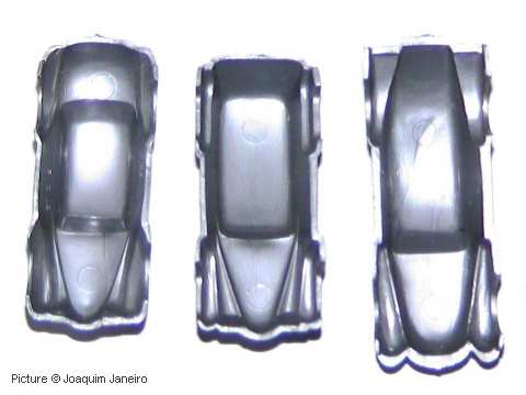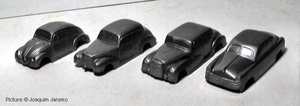 Case #9 - January 2005 Joaquim Janeiro, who has a habit of finding items that are diffcult to identify (see Vault case #8 !), found these 8 plastic bodies without bottomplates or wheels on Ebay. Some of them, for instance the Opel Olympia 2-door and Van, the VW Beetle and the Mercedes look like Wiking or Tekno copies. One of the models looks like an 1938 Opel Kapitan 2-door. There are no marks of any kind in or on the bodies, but their finish is very smooth, just like any other industrial plastic model. Update October 2007: Carsten Neumann e-mailed us and told us that the models seem to be Wiking copies. The original Wiking models are (picture 1, left to right) Volkswagen Käfer (Beetle), Mercedes 220, Mercedes 300 (Adenauer) and US-Limousine (unspecified american sedan) and (picture 2, left to right): Opel Olympia 1951, Opel Schnelllieferwagen (small delivery Van) and Schräghecklimousine (unspecified, maybe 1938 Opel Kapitän). The US-Limousine and the Schräghecklimousine never had a chassis, but at the US-Limousine the frontbumper is missing. Additional information is still welcome !