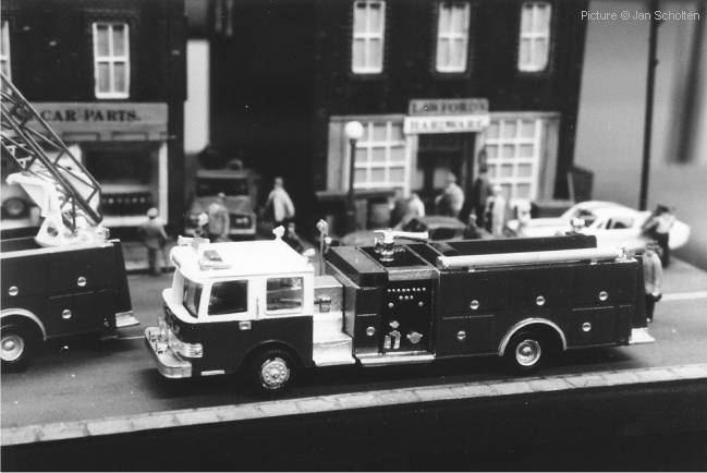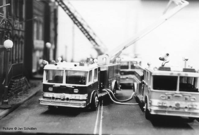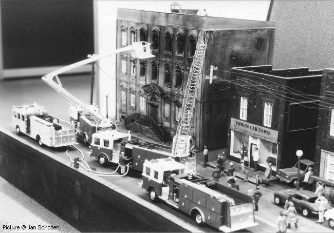DJH / Grandspot Jan Scholten sent us these pictures of a DJH diorama that was on display at the Nuremberg toyfair (1988?). Apart from the Pierce Fire Engine models which are prominently visible in each picture other DJH models can also be seen in the diorama.