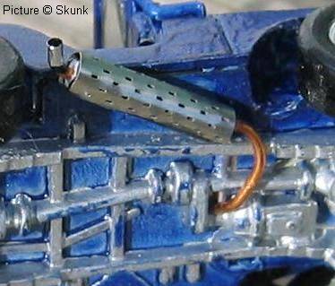 Cut out a piece of plain kitchen aluminium foil, 1 x 3 mm for instance. Wrap it tightly around metal wire, lengthwise. If there is leftover aluminium, cut it off with a very sharp knife. This should form a perfect little tube around the wire. (This may take a couple of tries, but foil is cheap and this doesn't take much time anyhow). When the foil is satisfactorily shaped, give it a layer of clearcoat. Be careful to paint only on the aluminium, and not on the wire. When the clearcoat has dried, carefully slide the aluminium off of the wire. Voila ! You have a perfect exhaust ! You can make it as thick or as long as you want. If one doesn't slide the finished exhaust off the wire entirely, it is possible to bend the wire any which way. Some examples: