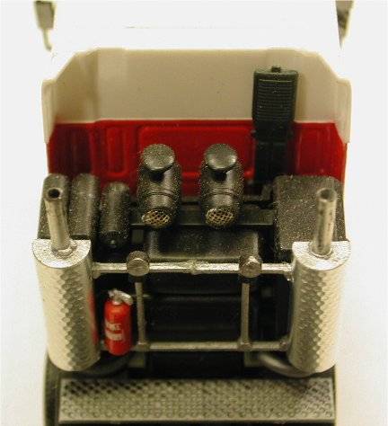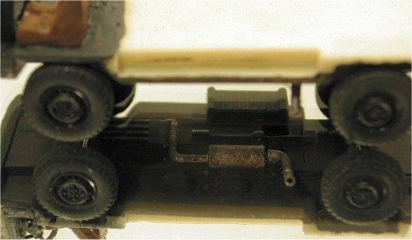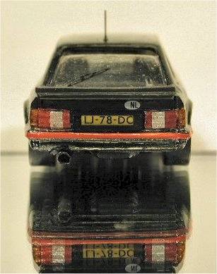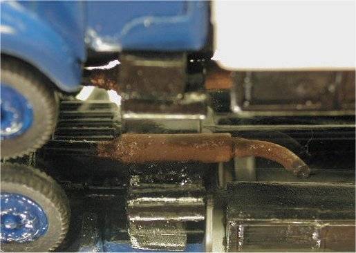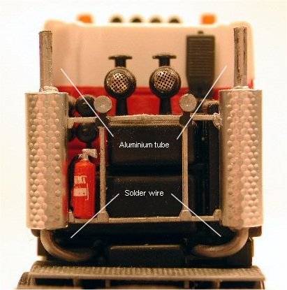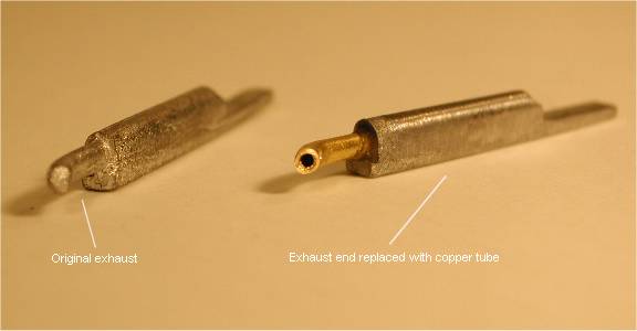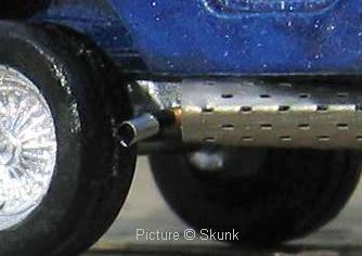 Here is another method to make exhausts, use 1 mm solder wire with a resin core for car exhausts and 2 mm wire for truck exhausts. The resin core of the solder wire can be drilled out with 0,7 / 1,5 mm drills (by hand, this is not really something to use a Dremel for) which leaves a metal 'pipe' that looks like the real thing. The advantage of the solder wire is that you only need to drill out 2-3 mm to make it look good and that you can bend the remaining piece of wire anyway you want ! Some examples: