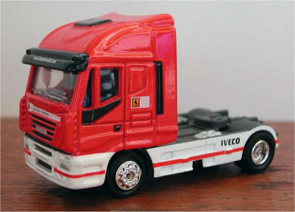 NewRay has released models in 1/87 before but these did not turn out as good as this nice combination of a die-cast Iveco Stralis tractor and plastic trailer in Ferrari colours. There is room for improvement though..