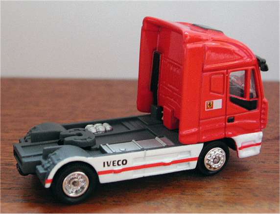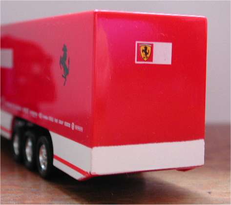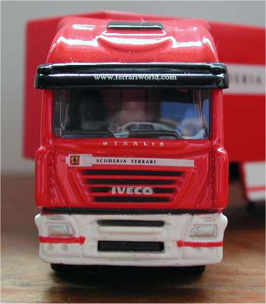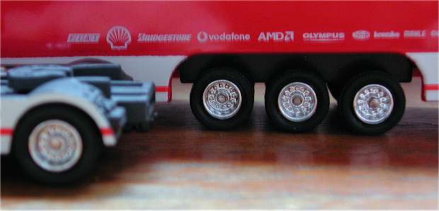 The rear of the trailer could have done with some details... nothing there at the moment. Considering the number of prints on the model NewRay could at least have added something like doors and lights on the back as well. Although not visible in these pictures, the trailer (that has been moulded in red and then spraypainted) also has dust particles in it's paint. Note: some prints may look vague in the pictures but that is caused by the resizing of the pictures. All prints on the model are excellent. The overall look of the model is good, and the printing is of high quality. Ofcourse it can not keep up with the Rietze Iveco Stralis when it comes to the details but it wouldn't be realistic to expect that. F1 experts will have seen that the model does not have all the logo's that the original truck has, the red and white logo and the name of a certain cigarette brand are missing, EU-regulations stipulate that these are not allowed on toys, so they weren't forgotten. All things considered, this is a very nice model in this price range.
