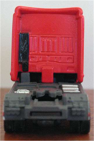 A closer look at the front of the cab reveals that the sunvisor doesn't sit straight and that the red line on the bumper isn't straight either. Note the crude air intake and the translucency of the paint on the back of the cab.