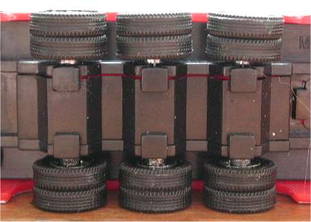 The wheels used on the trailer are the same as the ones on the drive-axle of the tractor which is not unusual on a model in this pricerange. What is unusual, and certainly not realistic, is that the trailer now has doubles on all axles. Considering the purpose of this trailer in 1/1, supersingle tires would have been better.