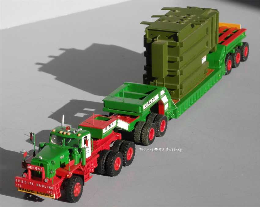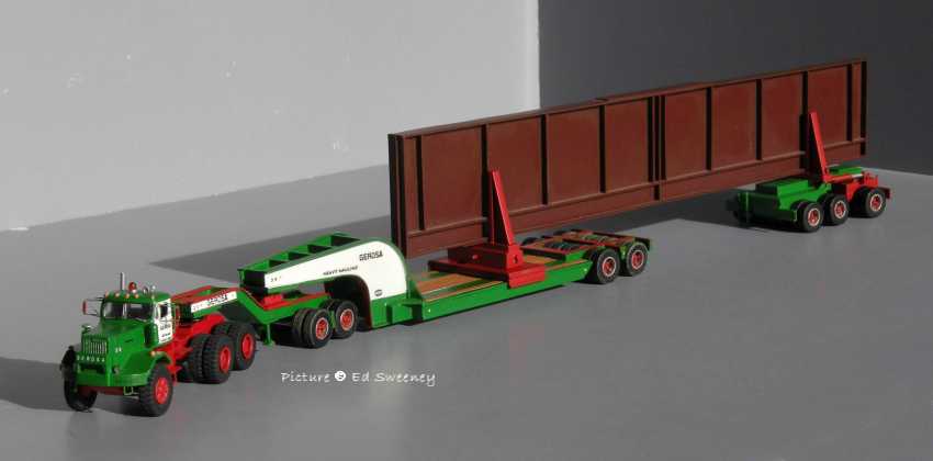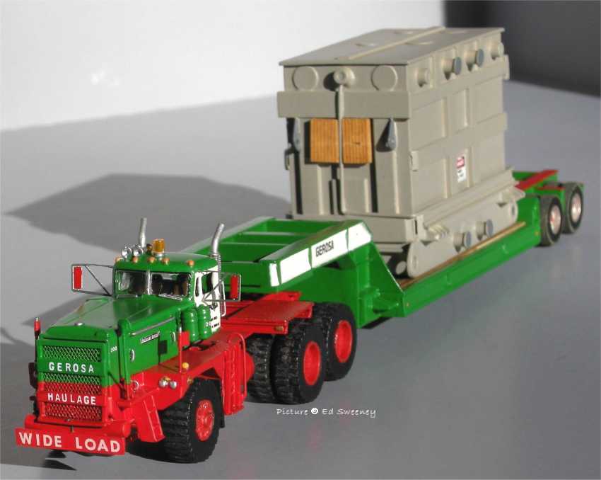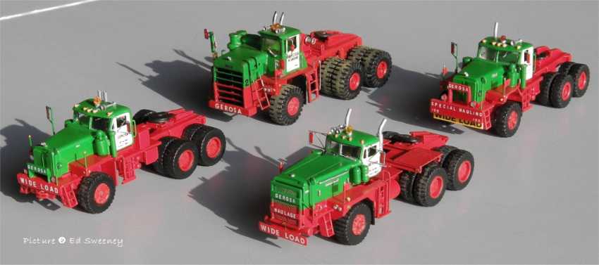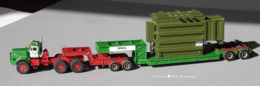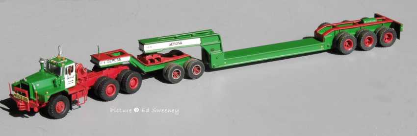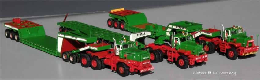 Models built by Ed Sweeney Ed Sweeney shows us some of the heavy haul models he built in 1/87 scale, most being in the colors of Gerosa Haulage. Except for the tires, all of the trailers are scratchbuilt and a large portion of the trucks are scratchbuilt with some parts coming from commercially available 1/87 models. All are custom painted and decalled.