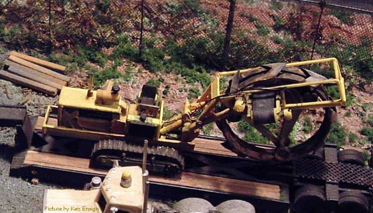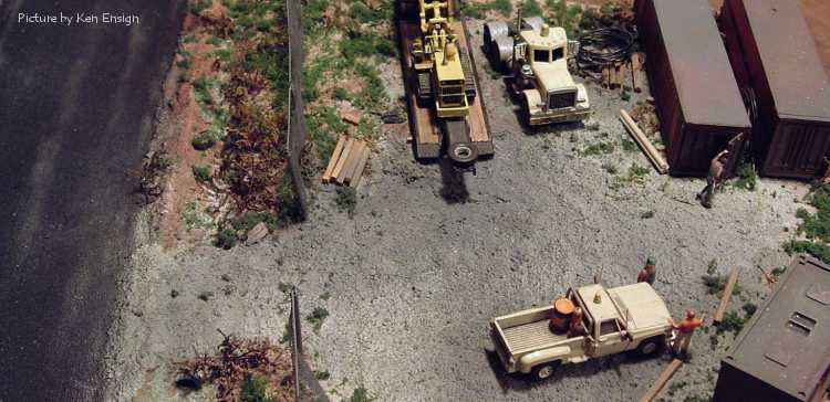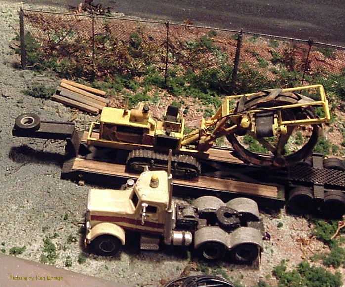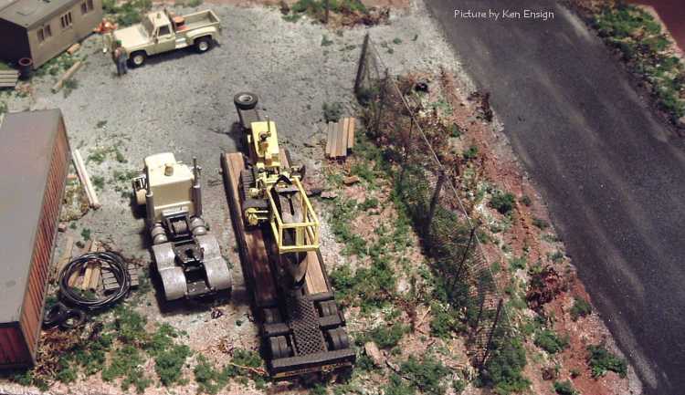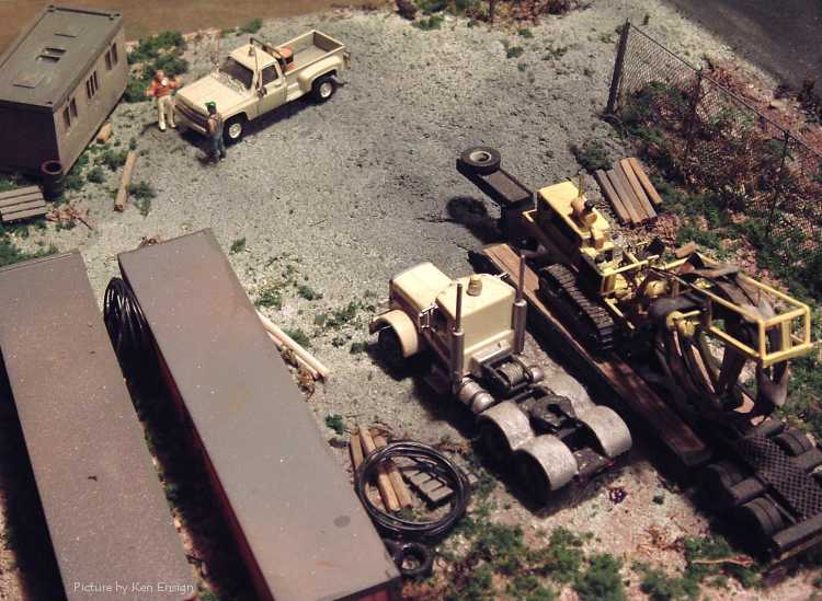 Dewy's Tiling Service A diorama built by Ken Ensign for a challenge held at the HO Vehicles Yahoo group. Part of the challenge was that three vehicles had to be used and one had to be something else than a truck. The diorama was required to be 12" x 16". The Peterbilt pictured is a modified Boley model, the trailer and tiling machine are scratchbuilt. The Chevrolet pick-up is a Trident model. The scenery is from bits and pieces, the storage units are either Zee Toy or Yatming box trailers and the fence was built from wire and bridal veil. |