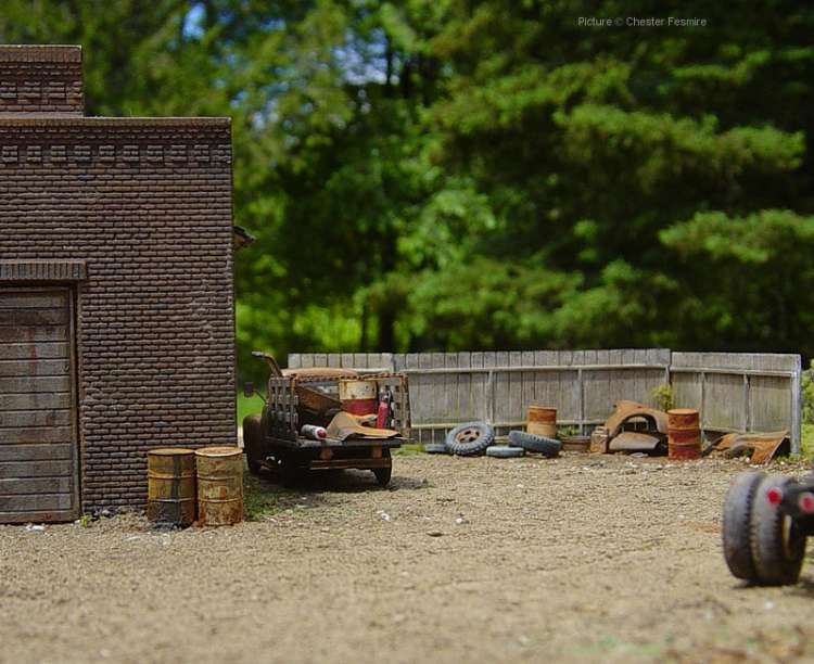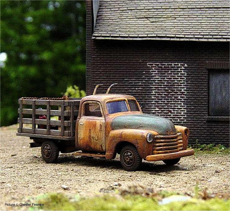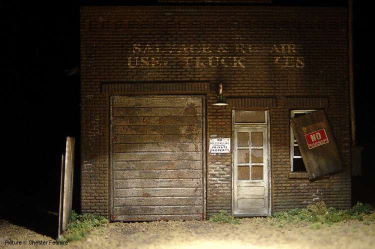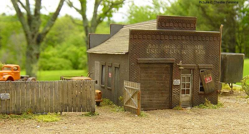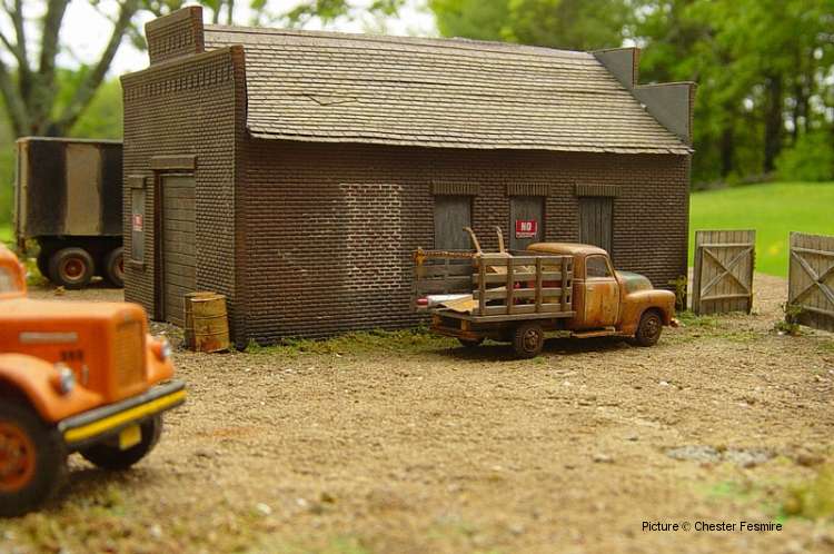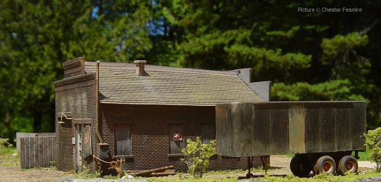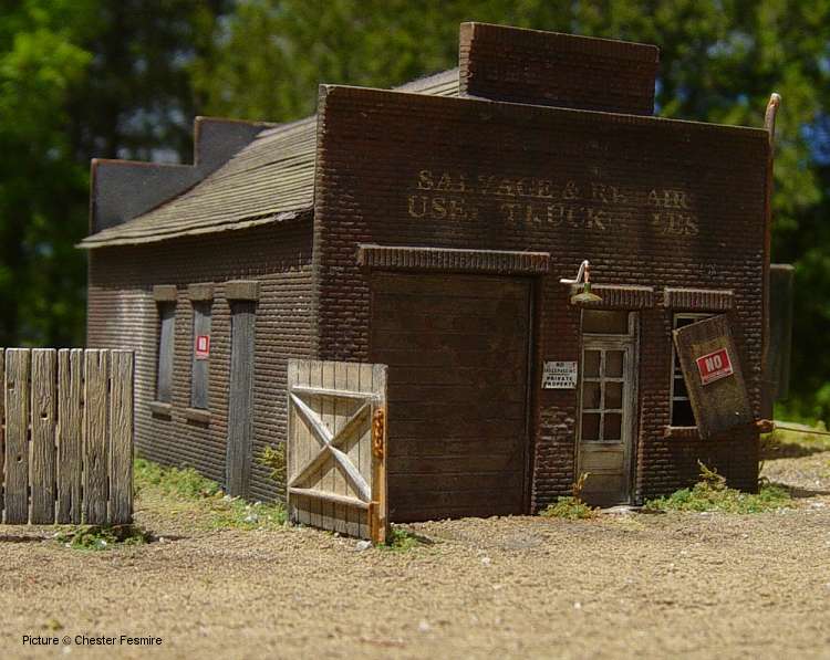 Showcase #26 Another fine diorama by Chester Fesmire, here's what Chester has to say about the diorama and the models: 'Here's a little truck repair and sales shop I put together and made abandoned. The vehicles seen are a weathered Busch stake bed Chevy, a Tyco trailer with A-line wheels and new landing gear and there's a Sylvan Scale White 4000 highway tractor back in the corner of the yard. All of the signs are decals on brass foil. The used parts laying around and in the back of the stake bed are foil I burnished over other models. Most of the weathering on the vehicles and structure are a combination of dry pastel chalks and chalk mixed with alcohol to make a wash. The one "nighttime" scene was done with a small pencil beam flashlight.'