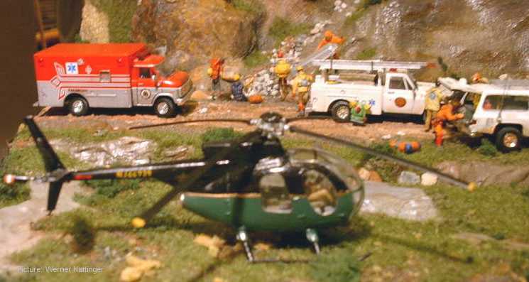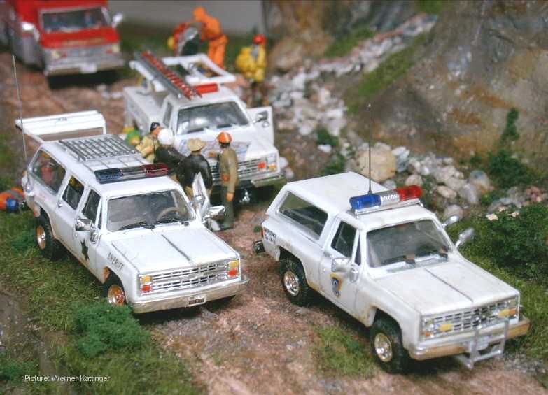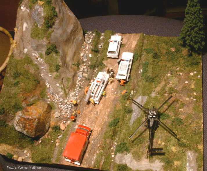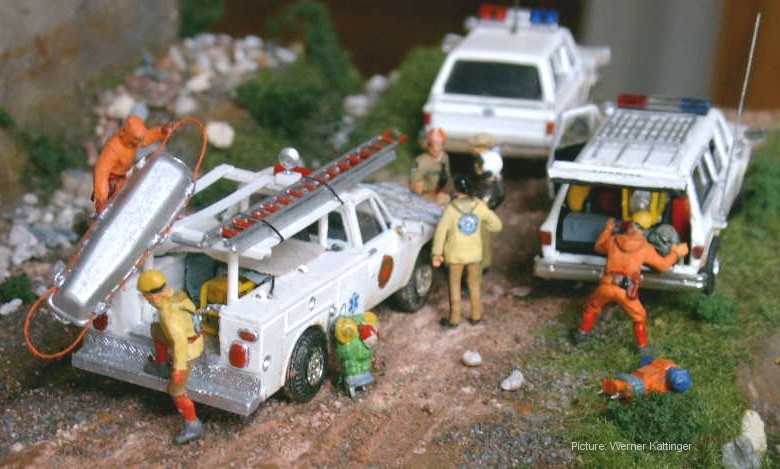 Showcase #28 A diorama built by Werner Kattinger who describes his diorama as 'depicting a search and rescue effort in the Rocky Mountains of Colorado where rescue teams have been brought up a mountain road to the head of a mountain trail, supposedly leading to the hikers in trouble. Also a Sheriff´s department helicopter has arrived (an 1/72 model, an aberration I know, but only this scale fits the 1/87 crew figures) and the pilot, the Sheriff in charge of the search mission and the leader of the mountain rescue team plan their next moves over a map of the area. All models are by Trident with some detailing.'