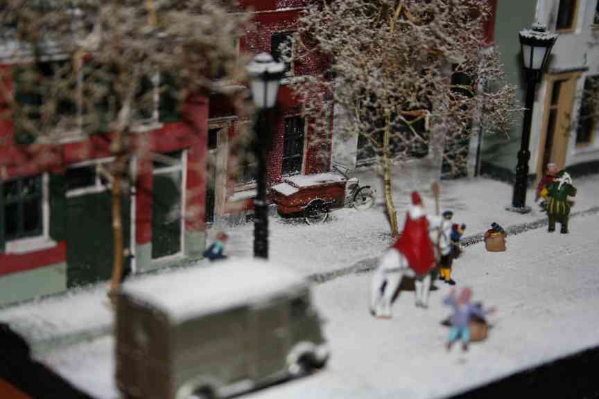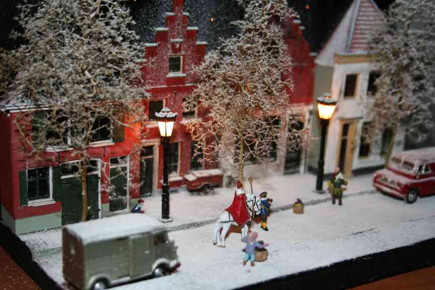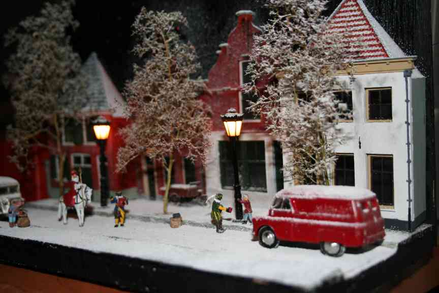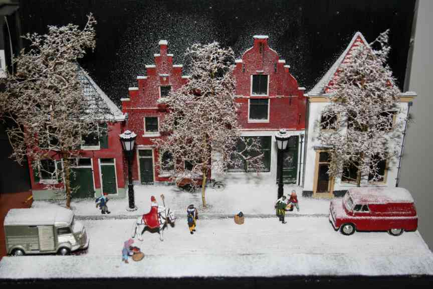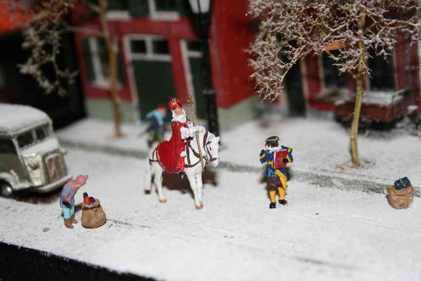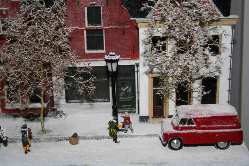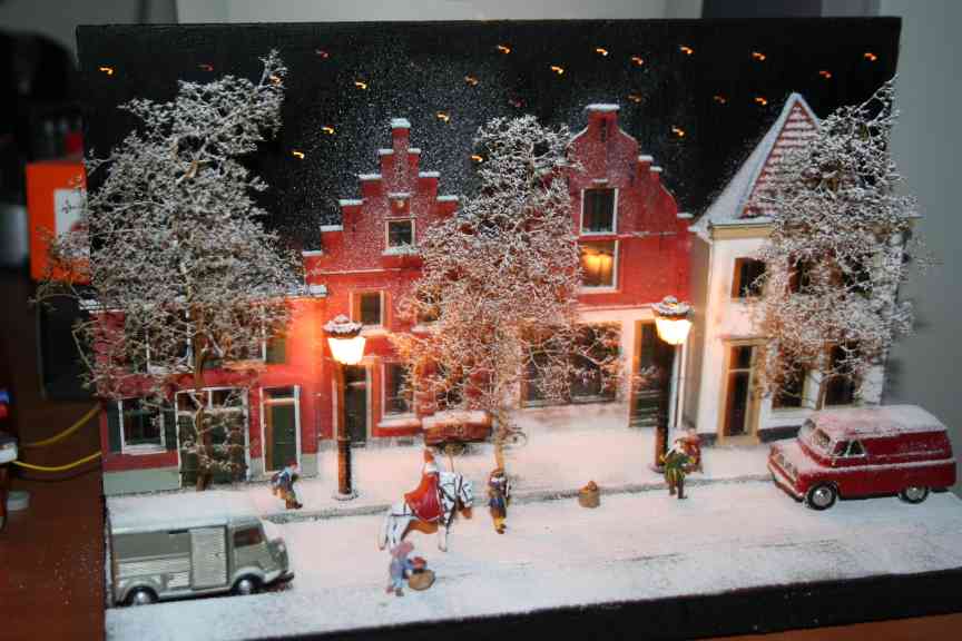 A diorama built by Jacco van der Kroon showing Saint Nicholas visiting a small dutch town. Saint Nicholas and his black Peters, the house gables and the delivery tricycle are all resin models made by Artitec, other figures are made by Preiser. The 'stars' in the background (visible in the pictures below) are made with fiber-optic cable. |