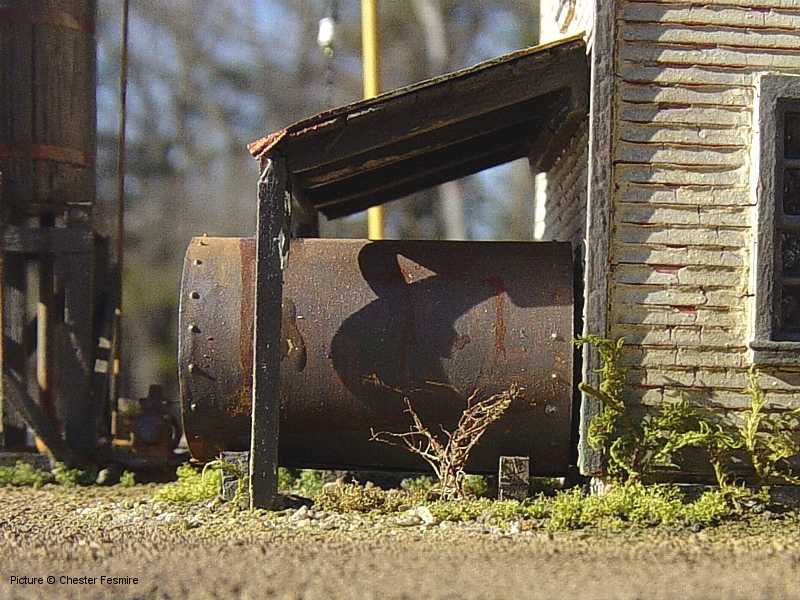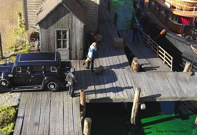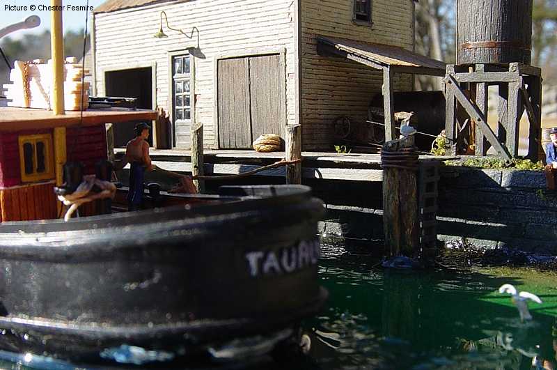 a waterfront diorama he recently built. With the exception of the vehicles, vessel and