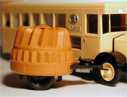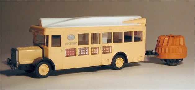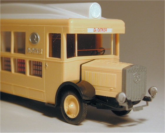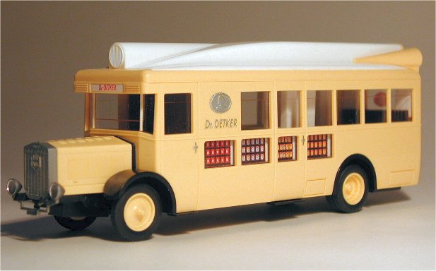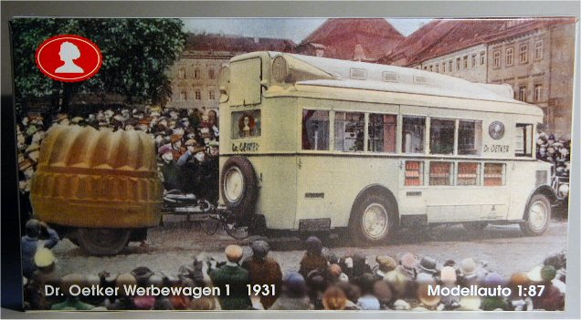 In the 1920s and 30s, most people only knew the shop where they did their shopping, and were not aware who the actual manufacturer of many products was. Products like flour and sugar were not even packed in individual packaging as they are nowadays but they were packed at the time they were sold in blank bags and boxes that were supplied by the shopkeeper or even brought by the buyer. To increase brand-awareness, the manufacturers realized that they had to advertize, which they did by using their delivery trucks as billboards at first. The next step was to use custom built cars, trucks and buses that could be used to attract attention, like cars with a bottle-shaped bodywork for instance. Later on, the manufacturers ordered trucks and buses that could be used for show and demonstration purposes. The Epoche model of a NAG K09/4 which was used by 'Dr. Oetker' is the 1/87 replica of one of these vehicles.