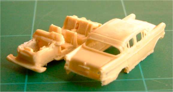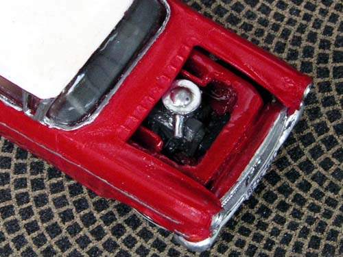 The separate air filter with its induction pipe is a prominent feature of the miniature engine. The radiator is a part of the chassis while the fan is a single piece. In my opinion the positioning of the engine is a bit off, in that most of it is obscured by the bulky front arm. The opening hood works by pragmatic mechanics. It locks in the desired position after a careful finishing. Cutting out the hood is troublefree because of the predetermined breaking lines, and there even is an extra piece for precautious modellers who would rather leave a safety margin and file off the rest of the hood when sawing it out of the body. Large and irregular gaps between body parts were common in the 1950s anyway.