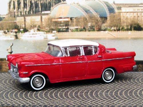 'Made in Germany' automobiles apart from the mainstream, complete with panorama windows and fins. The Kapitän P1 is from a time when new cars were essentially construction kits sent from Detroit. A Chevy could have looked the same. On the German market the 1958 Kapitän was not very well received and was soon replaced again in 1959. The latter one has been made by Wiking. For American standards the Kapitän is quite slenderly equipped: a 2.5 liters 6 cylinder engine and 80 hp had to suffice. Still, the German General Motors flagship could reach a top speed of 142 kph (88 mph). By the way: the origin of the slightly frivolous sounding nickname can be found in the unusually designed taillights.